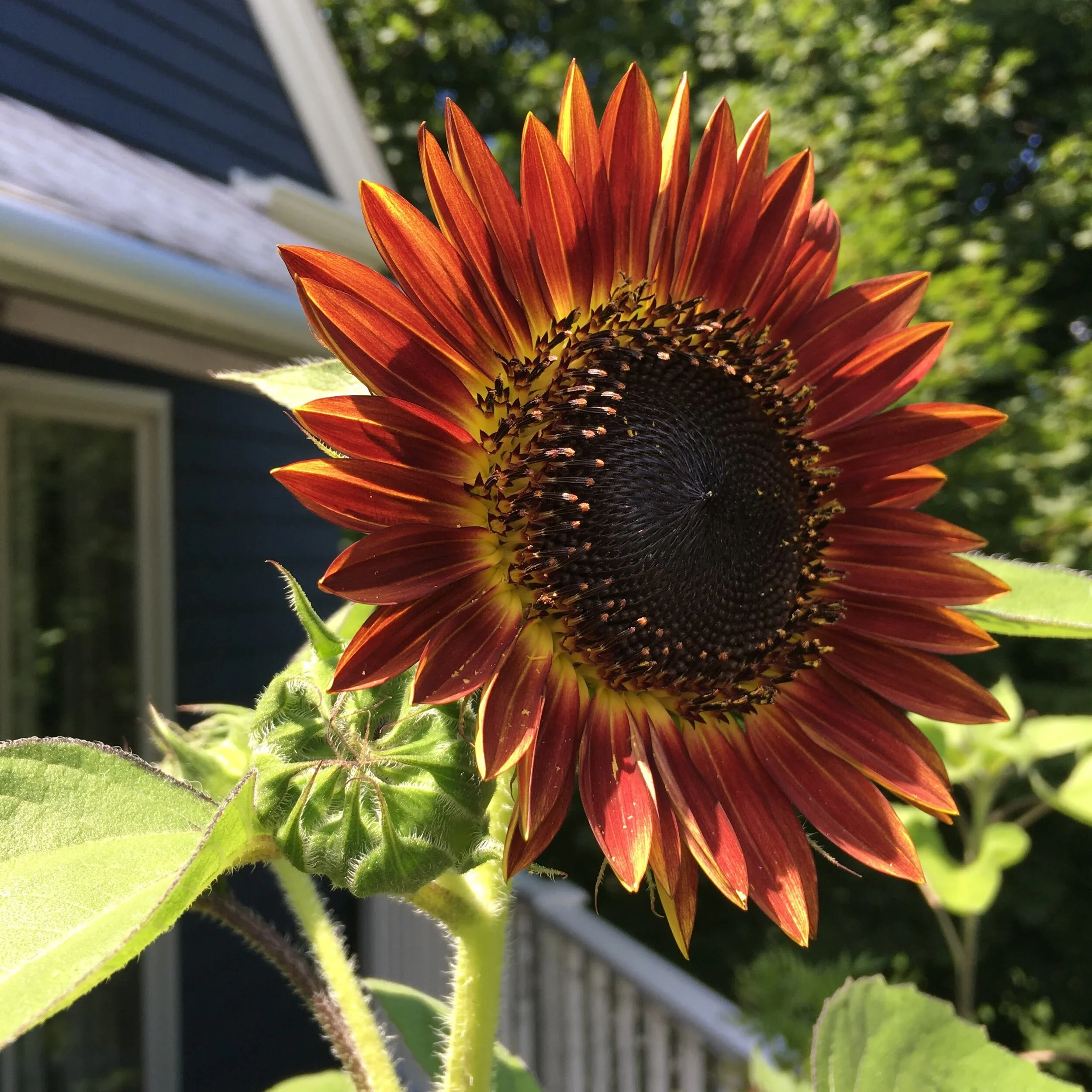 Greetings on a glorious (but grilling) day. My kitchen-porch sunflowers are in full bloom. Each morning sunlight streams through their petals. The leaves look like green elephant ears. Bees circle and zip, measuring the distance and potential of each bloom. Meanwhile, at ground level, four-footed marauders make off each night with ripening fruit, including sunflower blossoms. So my second floor garden, such as it is, is a gift and a victory.