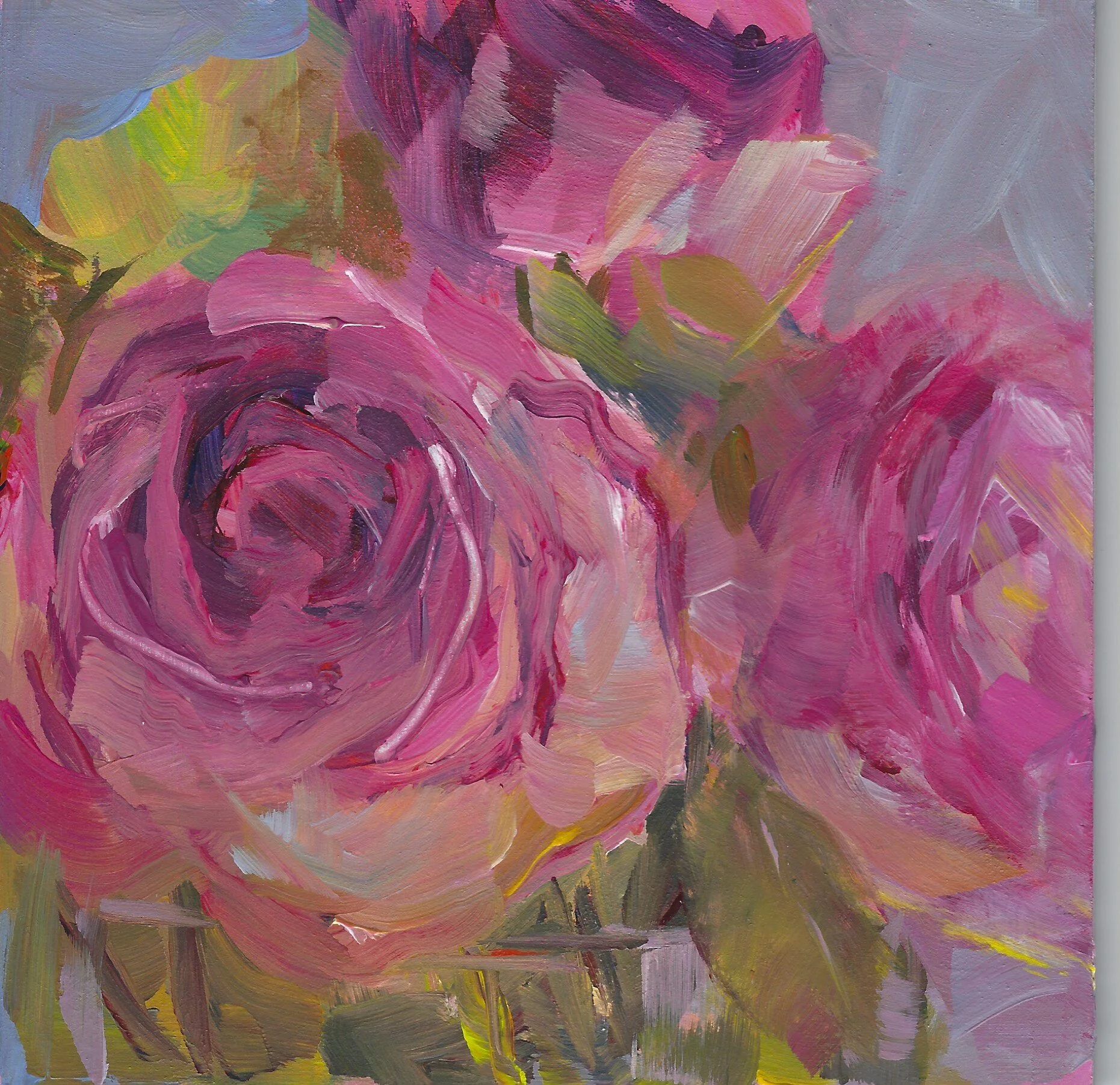 These past weeks I’ve been painting daily with a palette of 8 colors: a warm and a cool each of yellow, red, and blue, plus magenta and white. Perhaps it is time to limit myself even further. What would flowers look like, painted in neutrals? How to express luminosity with out pure yellow or pink?